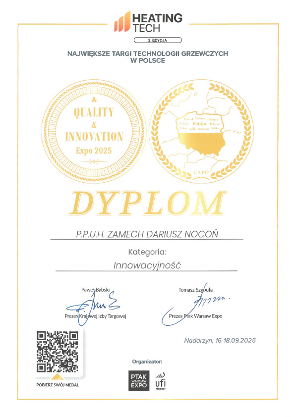Zdobycie Medal Quality of Innovation Expo 2025 przez firmę P.P.U.H. Dariusz Nocoń stanowi potwierdzenie, że nasz kocioł EKO Balance należy do najbardziej zaawansowanych technologicznie i ekologicznych urządzeń grzewczych dostępnych na rynku. To wyróżnienie jest dowodem uznania dla naszego wieloletniego zaangażowania w rozwój polskich technologii grzewczych, rosnącą rolę innowacji w krajowym przemyśle oraz wkład firmy w transformację energetyczną opartą na odnawialnych źródłach energii.